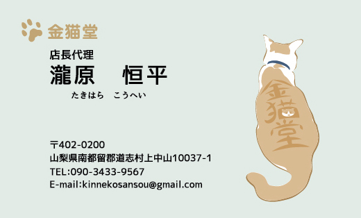 私が沖縄三線を師匠について学び始めたのが、かれこれ20数年前。 そのときからの古〜〜〜い三線仲間であり、猫好き、ワイン愛好家同士としてもずっと交流が続いてた瀧原氏から、名刺のご依頼がありました。